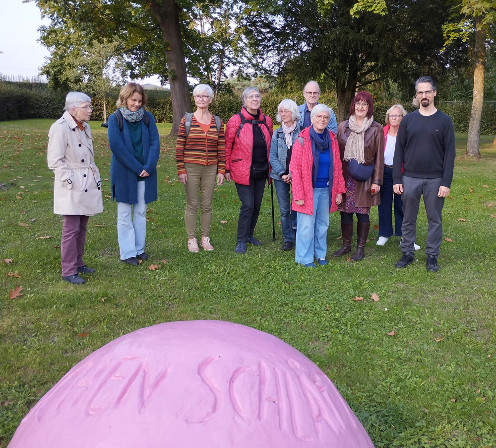 Monika Kallen, ehemalige Seelsorgerin der LVR-Klinik Rheydt, besuchte wieder die Gedenkstätte Waldniel-Hostert, dieses Mal mit weiteren acht interessierten Menschen aus Mönchengladbach. Das Betreuerteam des Gedenkortes, Dr. John Lentzsch, Hannelore und Peter Zöhren, informierte die Gäste über die Geschichte des Ortes, auch über die Vorgeschichte, die zu den Nazi-Morden an geistig behinderten Menschen in Hostert führte.